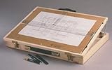 A completely self-contained system that includes a drawing board with parallel blade, a tilting mechanism for board angle, and a storage compartment for tools. Easily converts to a convenient briefcase with carrying handle. The drafting surface is reversible to put parallel blade inside case for protection when transporting. The drawing can be left in place when the unit is closed. Acrylic parallel blade for highest clarity and dimensional stability will not discolor and is not affected by sun or water. The cord mechanism, which keeps the blade parallel, is enclosed for trouble-free operation and provides easy adjustment of blade.